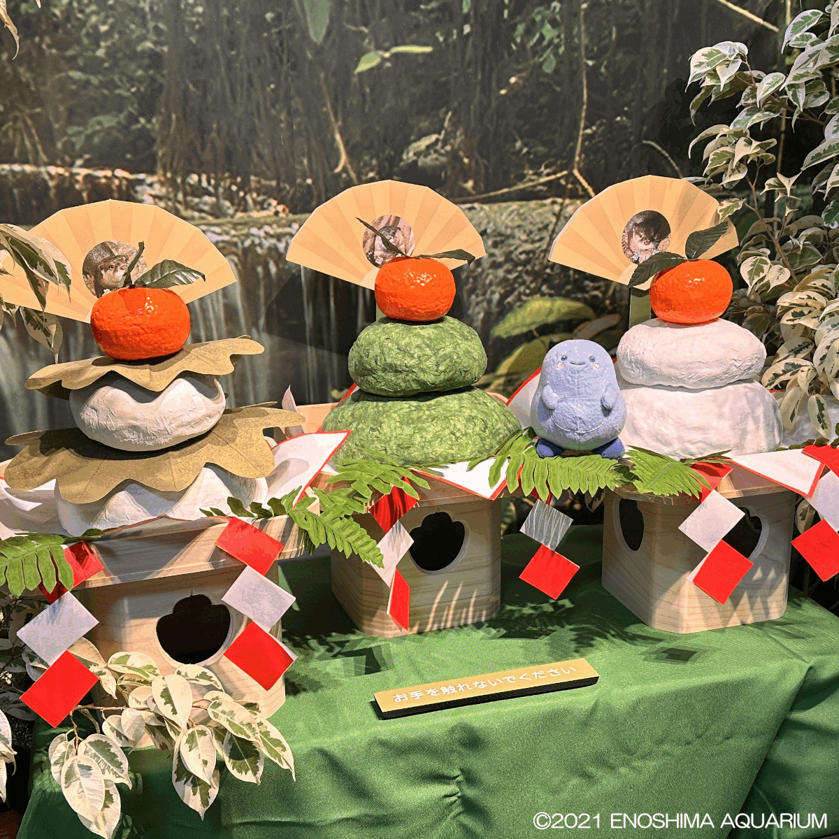 「ヨモギ」「カシワ」「オモチ」の“えのすいのカワウソ鏡餅”が飾られているよ。えのすいトリーターやスタッフが書いた絵馬も見てね。あわたんのもあるよ~