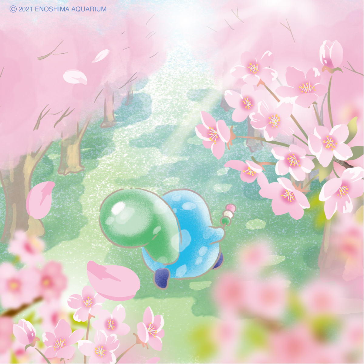 景色がピンク色になってきれいだね! お団子もおいしいよ